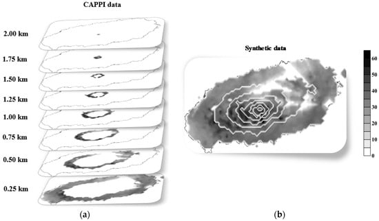 Every 10 min, eight radar composite reflectivity fields were prepared and used to create the ground-level composite reflectivity field for the entire Jeju Island. Figure 5 shows how the ground-level radar composite reflectivity field for the entire Jeju Island was constructed. At each altitude zone from 250 m to 2000 m, only the corresponding-altitude radar CAPPI data were used to make the ground-level radar composite reflectivity field. As the altitude increases, a much smaller toroidal radar CAPPI data field was selected (Figure 5a). Finally, by combining these donut-shaped fields, the full ground-level radar composite reflectivity field over the entire island could be created (Figure 5b). The radar reflectivity values in this figure are all within a maximum altitude difference 250 m to the ground.