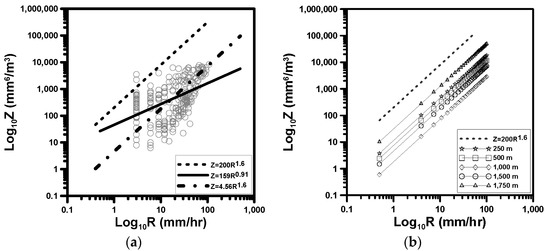 In this study, the Z-R relation was derived independently for each altitude zone; hence, the Z-R relation at one altitude zone (for example, 0–250 m) can differ from that at another (for example, 750–1000 m). Figure 6a shows the resulting Z-R relations that were derived for the altitude zone 1250–1500 m as an example, among which, the solid line represents the one derived without any constraints, and the alternated long and short dash line the one with a fixed exponent b = 1.6 as in Equation (3). The use of the exponent b = 1.6 was based on the visual comparison between the Marshall-Palmer equation [16] and the regression line derived simply by applying the least square method, i.e., . The Marshall-Palmer equation for the stratiform rainfall event, that is, , is also given by the dotted line in the figure for reference. By comparing these two lines on log-log paper, it was found that the slope of the regression line was closer to 1.6. Finally, after fixing the exponent to be 1.6, the new regression line was derived.