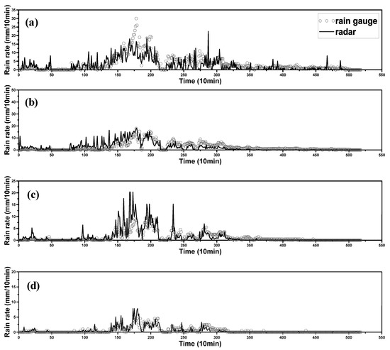 Third, it was also found that, especially for the rainfall duration of 10 min, the occurrence time of the maximum rainfall depth that was recorded by the radar rain rate data was different from the rain gauge rain rate data. Their locations differed as well. However, the occurrence time was the same for the long rainfall duration, like one day.