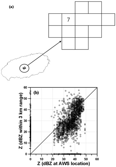 Though the radar and rain gauge rain rate typically match well, there were still some strangely high or low radar rain rates when compared with the surrounding values. It is also from the very high or low radar reflectivity data (hereafter, it is called the abnormal reflectivity). In this study, this abnormal reflectivity was removed by comparing it with surrounding reflectivity values within 3 km range. Figure 8 displays an example for the Witse Oreum AWS station located in the altitude zone of 1500–1750 m. Figure 8a shows the numbers of cells located within the 3 km range around the Witse Oreum AWS station (cell number 7). Since cell number 7 is located in the altitude zone 1500–1750 m, just a few cells are within a 3 km range at the same altitude level and other cells are located at other altitude zones of 1250–1500 m or 1750–2000 m. These cells were excluded in the comparison.