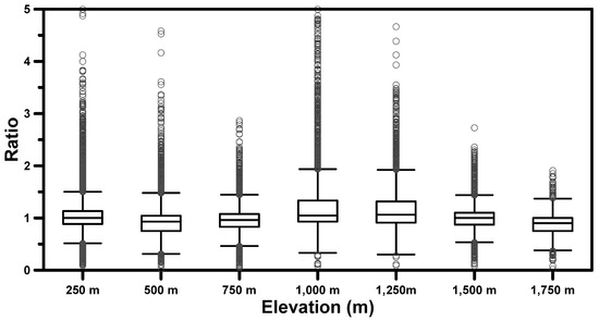 Because it was difficult to distinguish one radar reflectivity as abnormal, a threshold value was derived as the ratio between two adjacent reflectivity values. After summarizing the ratio data by a box-plot for each altitude zone, the values beyond the 1.5 × IQR (interquartile range) were assumed to be abnormal. Figure 9 displays the box-plots rendered for each altitude zone. Reflectivity values that were abnormally higher and lower than surrounding values based on the 1.5 × IQR were all removed. Finally, the removed reflectivity data were filled by the average reflectivity of the surrounding eight cells.