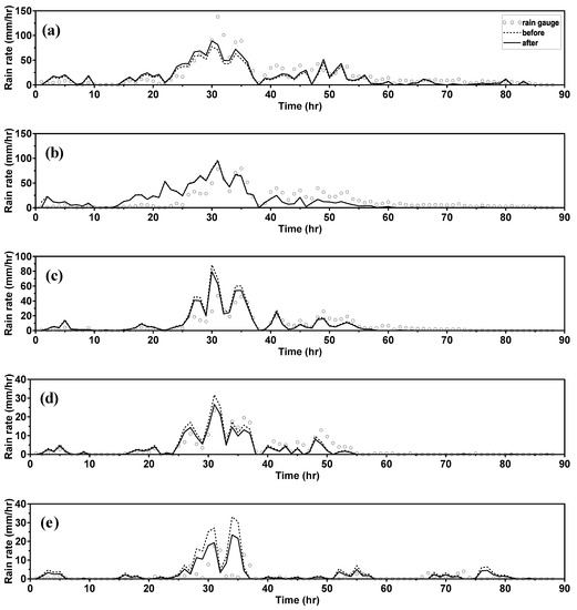 Comparison of radar and rain gauge rain rate before and after the G/R correction at several AWS locations (a) #871 (Witse-Oreum, 1750 m); (b) #870 (Jindallebat, 1500 m); (c) #782 (Seongpanak, 1000 m); (d) #751 (Seonheul, 500 m); and (e) #189 (Seoqwipo, 250 m).