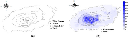 The Jeju Island, made by the volcanic activity of the Hallasan Mountain, is known as the rainiest region in Korea. Even though the height of the Hallasan Mountain is just 1950 m (and the altitude at Witse Oreum is 1673 m), many studies have reported that the rainfall in the Hallasan Mountain is strongly governed by the orographic effect [1]. It was also shown that, based on the rain gauge data analysis recorded from 2003 to 2012 (10 years) in the Jeju Island, there is a strong correlation between the annual rainfall amount and altitude, which is even stronger in the Hallasan Mountain [2,3]. The orographic rainfall has also been reported in many countries worldwide [4,5,6,7].