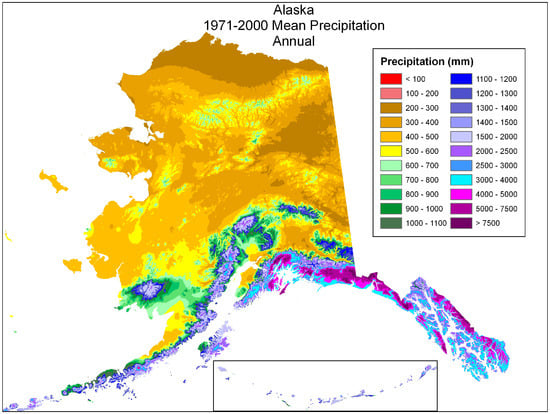 At the end of every decade, the National Climate Data Center of NOAA calculates the mean climatic values for all stations for the last three decadal time periods. These values, from which deviations are calculated, are frequently called ‘normals’. Normals are not constant and can change, at least slightly, by the end of every decade. The normals for the climate period of 1971–2000 form the basis of the precipitation map of Alaska presented in Figure 1.