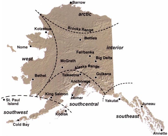 Location of the first-order stations and climatic zones of Alaska from Hartmann and Wendler [17].
