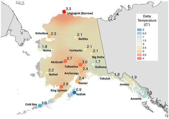 The highest temperature change values were observed in northern Alaska (Figure 3) as expected, while the lowest warming was experienced in maritime southern Alaska. This maritime region stretches from Cold Bay in the far west (1.0 °C), over Kodiak Island (0.9 °C), to Annette (1.3 °C) in the southeast. These values are for a 67-year period; however, they are still higher than the mean value of global warming.