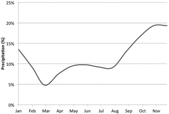 In Figure 4, the average annual course of precipitation change (%) for the mean of the 18 stations is presented. While a precipitation increase is observed for all months of the year, the maximum of the increase is observed in early winter. After a relatively warm summer, leaving a fair amount of water vapor content in the atmosphere, the cooling does not allow this moisture to stay in the atmosphere. In early spring, the opposite effect happens. After the cold winter, the atmosphere is relatively dry, so we observe the minimum increase in precipitation.