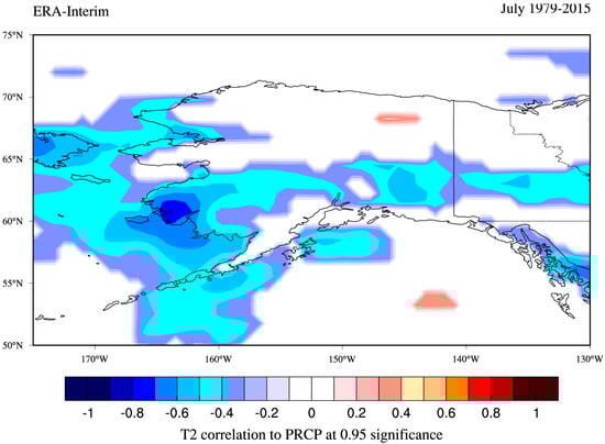 Correlation between precipitation and the 2-meter mean temperature (°C) for the Alaska region for the month of July as derived from the ERA-Interim reanalysis, 1979–2015 [21].