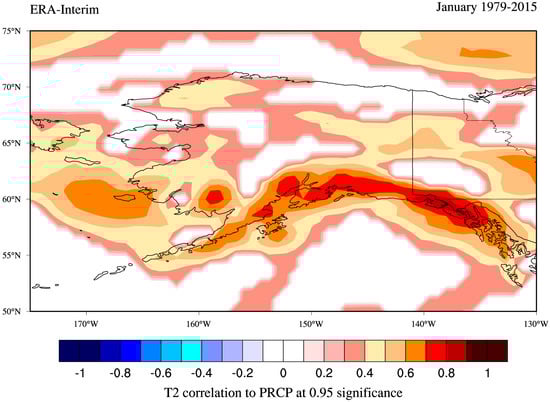 Correlation between precipitation and the 2-meter mean temperature (°C) for the Alaska region for the month of January as derived from the ERA-Interim reanalysis, 1979–2015 [21].