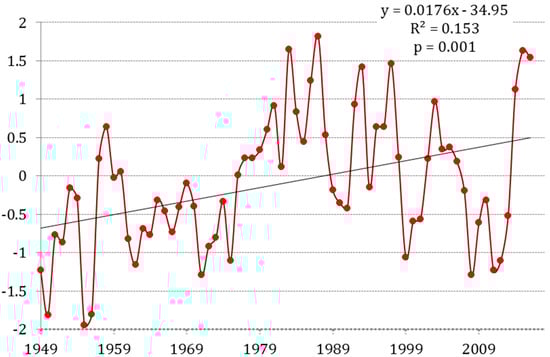 In Figure 7, the annual PDO values for 1949–2016 are presented. The values vary widely from year to year. Furthermore, the last three years of our time series had highly positive PDO values, which brought above normal temperatures. Above normal summer season temperatures are typically a result of stable high-pressure systems lasting several weeks; these weather situations may cause increased biomass burn activity, especially in Interior Alaska. The first half of the summer of 2015 was characteristic for widespread forest fires, which resulted in the second highest number of fires in Alaska’s wildfire record in over 50 years. However, there were below normal amounts of wildfire and cooler temperatures in the seven years prior to 2015 [23].