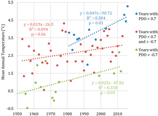 Mean annual temperature of Anchorage (1949–2016) as a function of different classes of the PDO values.
