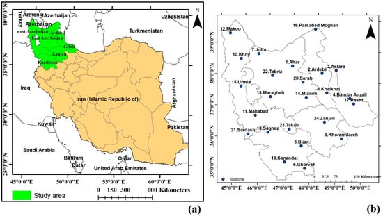 In the present study, monthly rainfall time series of 24 weather stations between 1981 and 2015 were used. The spatial distribution of the weather stations is depicted in Figure 1. The data was obtained from the Islamic Republic of Iran Meteorological Organization (IRIMO). The time series have no missing value during the period. The homogeneity of the time series was also analyzed by applying four statistical tests, including the standard normal homogeneity test [29], the Von Neumann ratio test [30], the Pettitt test [31], and the Buishand range test [32].