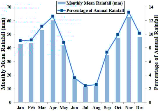 The seasonal (cumulated) distribution of precipitation over the study area can be calculated using monthly precipitation values and considering hydrological seasons. Autumn with an average amount of precipitation at about 158 mm that constitutes 33% of the total annual precipitation seems to be the wettest season. Winter is also the second rainiest season with the mean precipitation at 139 mm and 29% of annual precipitation. The mean annual rainfall in spring is 119 mm, and a quarter of annual rainfall occurs during this season. The driest season on the other hand is summer, with a mean precipitation of 59 mm, and about 12% of annual precipitation. In summary, approximately 88% of annual total rainfall occurs during autumn, winter and spring.