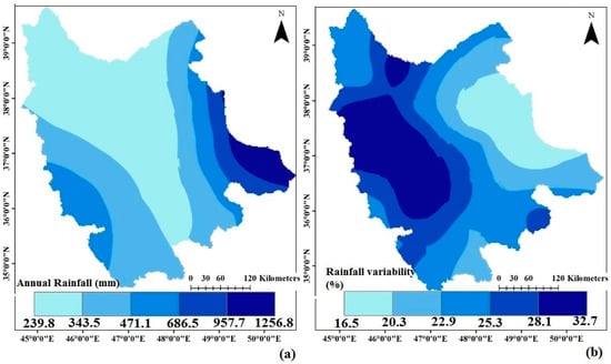 Spatial distribution of (a) mean annual rainfall, and (b) rainfall variability over the northwestern corner of Iran.