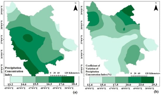 Spatial patterns of (a) precipitation concentration index (PCI); and (b) Coefficient of variation of PCI.