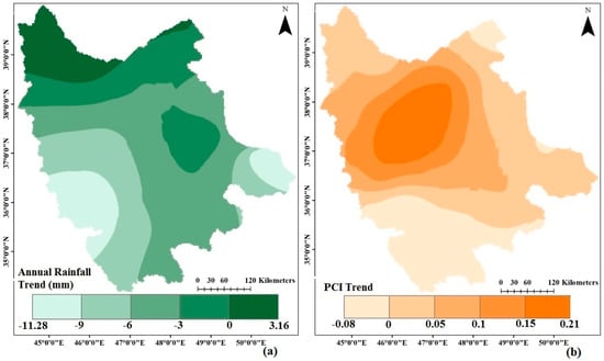 Spatial distribution of trends of (a) annual rainfall; and (b) PCI over northwest Iran from 1991 to 2015.