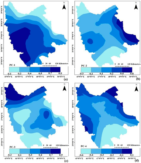 Applying the PCA to the annual rainfall time series, the retained PCs were rotated by the varimax method (Table 4). The spatial distributions of the first four rotated PC scores over northwest Iran are depicted in Figure 6. The spatial pattern of the first PC score is similar to the spatial patterns of rainfall variability (Figure 3b) and PCI (Figure 4a), delineating the southwestern corner as a distinct region with the highest amounts of values; the values then decline gradually when moving from southwest to northeast. This suggests that the spatial pattern of rainfall variability and PCI can be shown by the first PC score. The second PC score, PC-2, has the highest positive values over the eastern and southwestern parts of the study area, including the regions with higher mean annual rainfall (Figure 3). The PC-3 score shows the lowest values over the southeastern and southwestern parts and the highest values over the northern part, including the regions with the lowest and highest PCI variability (Figure 4b), respectively. The fourth PC score, has also higher values over the northeastern and northwestern parts, depicting the areas with the highest PCI variability (Figure 4b). In summary, the first PC score coincides well with the rainfall variability and PCI maps, and the second PC score refers to the rainy areas in the eastern and southwestern parts (map of mean annual rainfall), while the third and fourth scores coincide relatively well with the map of coefficient of variation of PCI.