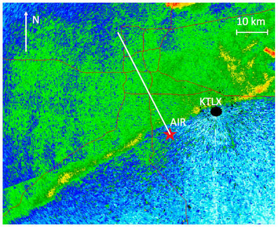 This study is primarily focused on observations of a cold front which passed through central Oklahoma between 0130 UTC and 0400 UTC on 19 September 2015. The AIR deployed on the north side of Norman, Oklahoma at 0215 UTC, and began collecting data at 0226 UTC. During the scan, the AIR did not rotate in azimuth; instead, data were collected along one radial, allowing for maximum temporal resolution and added flexibility of changing temporal sampling during the processing phase. A diagram showing a low-elevation PPI from a local NEXRAD (KTLX), the AIR location, and the AIR scanning radial is shown in Figure 1.
