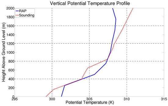 In this case study, in situ thermodynamic data were unavailable. Because the data were collected around 0300 UTC, a sounding from the local site (launched at 0000 UTC) did not provide an accurate depiction of the vertical thermodynamic profile during the scan. As a proxy for in situ thermodynamic data, a sounding from northern Oklahoma, also launched at 0000 UTC, was used. This was done because this sounding (hereinafter referred to as the ‘displaced sounding’) was launched shortly after cold frontal passage, and offers thermodynamic data after cold frontal passage. The thermodynamic profile (potential temperature data shown as the blue line in Figure 2) shows evidence of frontal passage based on (1) northerly wind direction in the lowest 1 km (not shown); and (2) nearly zero lapse rates throughout the lower half of the boundary layer []. To obtain another estimate of the vertical thermodynamic profile for Richardson number estimation, vertical thermodynamic data from the RAP model was used. The data used were from the 0300 UTC RAP analysis (dashed red line in Figure 2), with the model sounding taken from a gridpoint close to the scanning location where frontal passage had already occurred. These vertical thermodynamic data were combined with AIR data to estimate Richardson number by using the vertical potential temperature change with height from the sounding and the vertical wind shear from the AIR data.