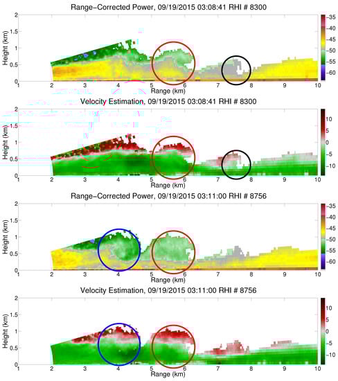 A demonstration of the shape and appearance of each observed KHI in range-corrected power return (dB) and in manually dealiased radial velocity (m·s). The black circles in the top panels show a decaying KHI at 7.5 km in range. The red circles in all four panels represents a KHI at 5.75 km in range, and the blue circles in the bottom 2 panels represent a newly formed KHI at 4 km in range. The time elapsed between the two sets of panels is 139 s. The cold front motion is from right to left. A 3 × 3 Gaussian smoothing filter has been applied to power for noise reduction purposes.