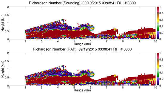 Richardson number estimation by using displaced sounding data (top panel) and RAP model output (bottom panel).