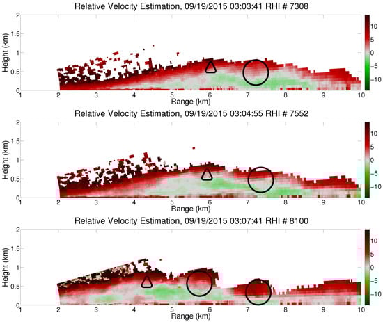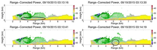 In addition to KHIs, feeder flow was also observed in the 19 September 2015 cold front case. Feeder flow is a relative rear-to-front low-level mass transport, and is typically present behind the leading edge of a density current []. This region of faster air transports scatterers towards the nose of the front; this flow results in either a mass buildup at the nose of the boundary, or a ‘rotor circulation’ in which scatterers are lofted up near the nose of the front []. While feeder flow is typically present in density currents, not all cold fronts contain a feeder flow []. In the case of the 19 September 2015 cold front, feeder flow spanning approximately 100–150 m in height is observed behind the leading edge of the cold front, passing underneath the KHIs. The process in which the feeder flow is severed is shown in Figure 5.