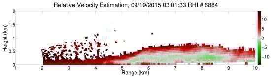 Presence of a Richardson number below the critical Richardson number (0.25) has been shown to coincide with the formation and sustenance of KHIs []. However, for Richardson numbers below this threshold, there is no complete existing theory in the literature which attempts to explain why there is a correlation between Richardson number and the ratio of KHI height to KHI spacing. In the 19 September 2015 case, relative velocity estimates (with respect to the cold front motion) reveal a region of rear-to-front flow behind the leading edge of the cold front. This phenomenon is shown in Figure 6. Because of the RHI scanning configuration, it is not known at this time whether this region of relatively high radial velocity estimates is a jet (with minimal horizontal extent) or a shear layer, spanning a greater distance along the cold front. However, we believe that because KHI initiation should not be limited to this specific cross-section, this phenomenon is most likely present across a wider horizontal extent, which would be most consistent with a shear layer. A PPI scan would be necessary to definitively diagnose the horizontal extent of this region.