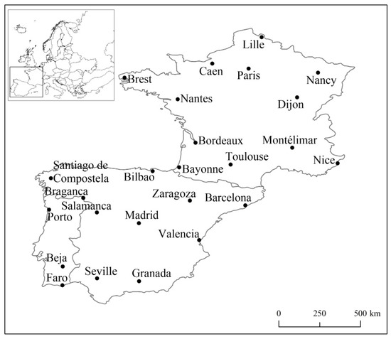This study was conducted on the basis of daily values of the maximum (Tmax) air temperature from 25 stations located in France, Portugal and Spain from the period 1976–2015 (Figure 1). These data are derived from the databases of the National Oceanic and Atmospheric Administration (NOAA) (available at: https://www7.ncdc.noaa.gov/CDO/dataproduct).