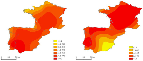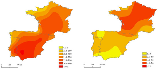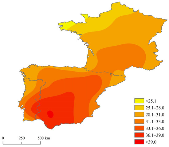 The value of the 95th percentile of Tmax ranged from 23.5 °C in Brest, France to 38.9 °C in Seville, Spain (Figure 2). The aforementioned assumption was based on the definition of an extreme weather event included in IPCC reports [35]. According to the report, a weather phenomenon that is so rare within the particular area that it lies within the 10th or 90th percentile range of an observed probability density function is defined as an extreme weather event. The abovementioned threshold is commonly used in research studies concerning HWs [10,36,37]. Within the analysed area, other threshold values for distinguishing HWs were established; for example, a maximum temperature of >36.5 °C or 41 °C in Spain [38,39], or >32 °C in Portugal [40]. The assumption of the aforementioned thresholds was justified with a substantial increase in the number of deaths. On the other hand, in France, the adopted Tmax threshold was 30 °C, which corresponds to values above the 95th percentile [27].
