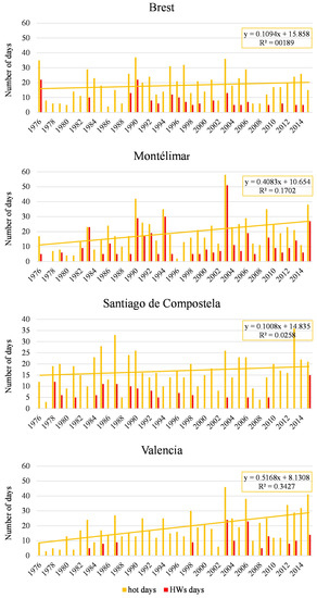In Western and Southwestern Europe, there were between 15 and 20 hot days observed on average annually in 1976–2015. During this period an increase in a number of hot days was observed in 96% of the stations, and in 72% of the stations the positive trend was statistically significant (p < 0.05). Lower trends (increase by <2.5 hot days per decade) were observed in western parts of the studied area (Lille, Caen, Brest, Nantes, Bilbao, Santiago de Compostela, Porto, Beja, Faro), while in eastern parts the increase in number of hot days exceeded four per decade (Nancy, Montélimar, Nice, Barcelona, Zaragoza, Valencia, Granada) (examples in Figure 3). The consequence of the rising number of hot days was an increase in the frequency of HW occurrence.