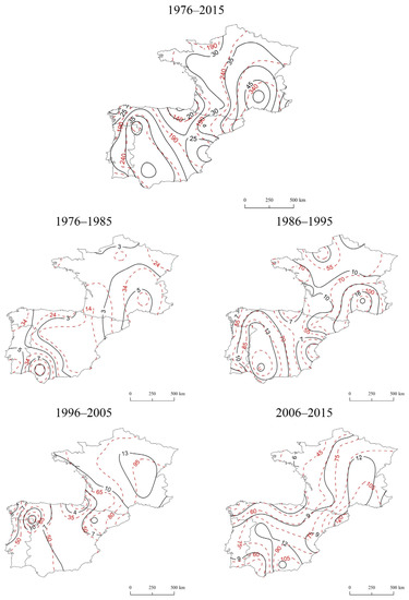 According to the authors of the Fifth IPCC Assessment Report [1], an increase in the mean global temperature between 1880 and 2012 amounted to 0.85 °C, and the period 1983–2012 in the Northern Hemisphere was probably the warmest 30-year period during the last 1400 years. As Rodríguez-Puebla et al. [2] showed, the averaged decadal increase in the maximum temperature in the Iberian Peninsula between 1950 and 2006 fluctuated around 0.2 °C ± 0.05 °C. In Portugal, decadal changes in the maximum temperature of 1976–2006 multiannual period oscillated around 0.49 °C [3]. A similar direction of changes was also observed in Spain, and this increase was approximately 0.11 °C per decade in the period 1850–2005 [4], while in the period 1961–2006 it was about 0.32 °C [5]. On the other hand, in France, the maximum temperature decadal changes fluctuated around 0.35 °C in the period 1958–2008 [6]. In conclusion, the trends of changes in maximum temperature ranged from 0.11 °C to 0.49 °C per decade, depending on the period and region.