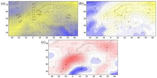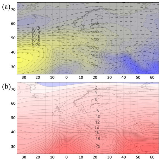 The mean sea level pressure in the summer season (June–August) in the Euro-Atlantic sector reached the highest value in the area of the Azores Islands (>1024 hPa) and dropped gradually in the northerly direction (Figure 5). The centre of low pressure was located in the southwest of Iceland (<1010 hPa). Between the mentioned pressure centres over the ocean, considerable horizontal pressure gradients were observed and lower gradients were found over the continent. In warmer air masses, air pressure is dropping slower with height than in cooler ones; therefore, z500 hPa in warmer masses is higher. Therefore, the 500 hPa mean geopotential height was inclined towards the north. Its maximum height was recorded over the Mediterranean Sea (>5880 gpm), and the minimum was found over the northern Atlantic (<5500 gpm). Air temperature on the geopotential height of 850 hPa decreased from the south (>20 °C) to the northwest (<0 °C). The aforementioned pressure system caused western circulation, both in the middle and lower troposphere typical for Europe and mid-latitudes in general.