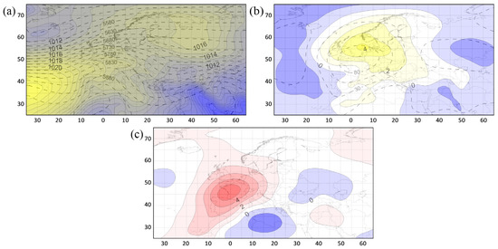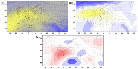 Composites of SLP in hPa (colour scale) and z500 hPa in gpm (dashed lines) (a); anomalies of SLP in hPa (colour scale) and z500 hPa in m (dashed lines) (b); anomalies of T850 in °C (c) for the HW of 29 July–14 August 2003.