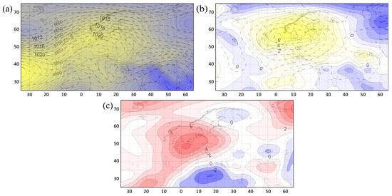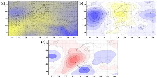 Composites of SLP in hPa (colour scale) and z500 hPa in gpm (dashed lines) (a); anomalies of SLP in hPa (colour scale) and z500 hPa in m (dashed lines) (b); anomalies of T850 in °C (c) for the synoptic type 2 causing HWs.