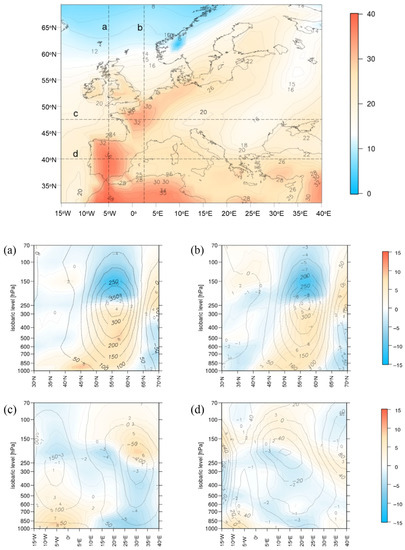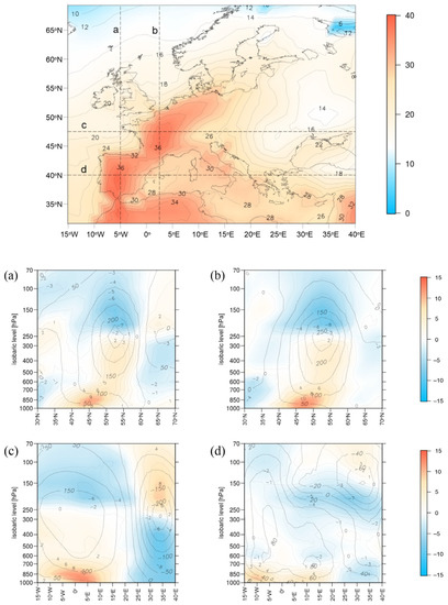 The vertical sections through the troposphere constructed for 12 August, which was one of the hottest day during the 2003 HW, show positive height anomalies occurring at every isobaric level over the areas of HW occurrence. The maximum values, exceeding 250 m, were observed for 300–250 hPa geopotential height (Figure 11). This means that the strongest signal of HW presence, concerning anomalies in the pressure field, was detected in the upper troposphere at an approximate height of 10 km. The highest positive T850 anomalies were recorded over northwestern France (exceeding 9.5°C). In the parallel and meridional tropospheric sections, the most considerable air temperature positive anomalies were observed at the lowest isobaric levels 1000–850 hPa (maximum >12 °C). Opposite anomalies of air temperature were observed in the upper troposphere, where the geopotential heights were shifted upward. Positive anomalies of the geopotential height mean lower air temperature is at an appropriate geopotential level. Therefore, the strongest negative anomalies of the air temperature (even <−8°C) were found right over the maximum positive anomalies of geopotential heights. The described pattern of air temperature anomalies can be explained by the scheme of the anticyclonic dynamic. In its upper part, the horizontal convergence of air masses that are initially cold results in negative temperature anomalies. Positive anomalies in the lower part are caused by the process of subsidence during the vertical motions activating strong adiabatic heating. Between the areas of negative and positive temperature anomalies a clear border area, corresponding to the maximum geopotential anomaly, occurs.