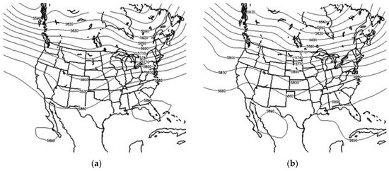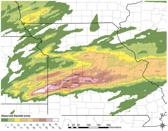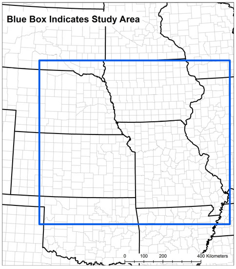 The radar reflectivity threshold of ≥40 dBZ was selected because Xu [22] showed that convective rainfall was associated with values of ≥40 dBZ. Radar data were inspected for each potential case to ensure convective rainfall occurred. Precipitation data were then plotted for the central CONUS. Because the precipitation is a point dataset, interpolation using the Aeronautical Reconnaissance Coverage Geographical Information System (ArcGIS) ArcMAP software package (Version 10.1, ESRI, New York, NY, USA) licensed to the University of Missouri, via kriging, was conducted to highlight areas that had an average precipitation accumulation depth ≥50.8 mm·day−1.