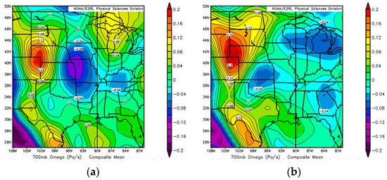 The 700-hPa vertical motion (ω) (Pa·s−1) (shaded; every 0.02 Pa·s−1) from −0.2 to 0.2: (a) composites for elevated convection; and (b) composites for surface based convection.
