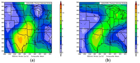 Figure 5 depicts the 700-hPa vertical motion (ω) for elevated (Figure 5a) and surface based (Figure 5b) composites. The elevated composites reveal much stronger upward vertical velocities (−0.12 Pa·s−1 compared to −0.06 Pa·s−1) and a larger coverage area. This figure is perhaps best viewed along with Figure 6, which is the 850-hPa isotachs (Figure 6a elevated, Figure 6b surface based). Together, these figures show that the Low level jet (LLJ) was stronger, more southerly and exhibited a much sharper wind gradient in the elevated convection composites. Additionally, the bulk of the omega (including maximum value) occurred along and to the left of the leading edge of the LLJ gradient. This pattern is a known influencer of elevated convection (see [3,4,29]) and speaks to increased coverages and longevity of elevated convection.