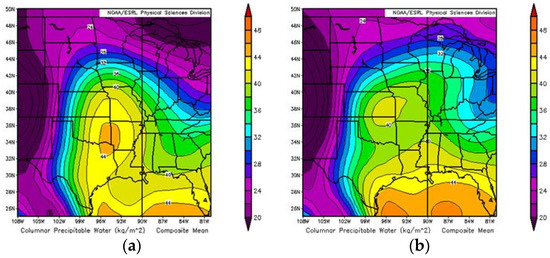 Surface-based composites also showed differences. Precipitable water values (Figure 7) were similar for both composite sets in terms of intensity (maximum values of 44 kg·m−2 for elevated, 40 kg·m−2 for surface based) which is logical given high moisture content is essential for heavy rain, which both elevated and surface based data sets have in common. However, the elevated composite (Figure 7a) clearly exhibits a south-to-north orientation of precipitable water, similar to that of the LLJ, while the surface based composite (Figure 7b) displays a less intense southwest-to-northeast oriented pattern of precipitable water. Clearly, the intensity and orientation of the LLJ played a role in moisture advection for these cases. The LLJ, in fact, is one of the main differences between the elevated and surface based composites and likely one of the primary sources of differences in overall rainfall amounts and areal coverage.
