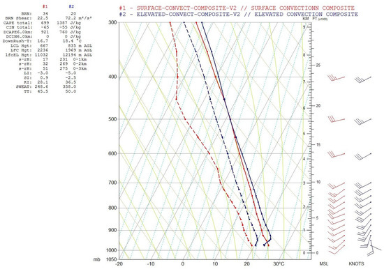 - Moore, J.T.; Czarnetzki, C.A.; Market, P.S. Heavy precipitation associated with elevated thunderstorms formed in a convectively unstable layer aloft. Meteorol. Appl. 1998, 5, 373–384. [Google Scholar] [CrossRef]