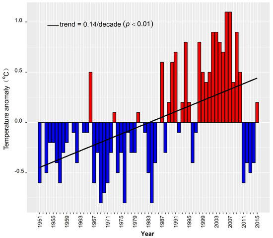 In mainland China, Hou el al. [18] reported the regional mean temperature increased by 0.14 °C per decade over 1961–2007 in East China. Moreover, Zhang et al. [19] reported that the increase in surface air temperatures occurred mainly in the northeast and the northwest over 1960–2005, while a decline was observed in the south. Ye et al. [15] also observed spatial variations of heat waves in China from 1961 to 2010 and found an increasing trend in the central part of South China. These changes have been linked with the El Niño–Southern Oscillation (ENSO) and atmospheric circulations in the East Asian summer monsoon (EASM) [20,21,22].