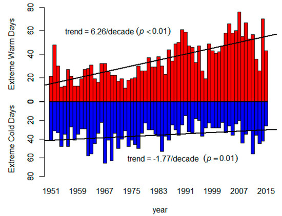 While extreme warm days increase, extreme cold days may decrease [7]. There is increasing evidence that the global warming is very likely attributable to anthropogenic increases in greenhouse gas (GHG) concentrations. Human influence has altered sea level pressure patterns globally [1]. Both GHGs and stratospheric ozone depletion have contributed to the observed poleward shift of the southern Hadley Cell border and the positive trend in the Southern Annular Mode in Austral summer [8]. The changes in the broad-scale circulation patterns have an important impact on regional temperature conditions [9,10,11]. A number of studies have shown that the rate of warming varies by region, climate and study period, and different measures of temperature extremes may present different trends [12,13,14,15]. For example, the frequency of extreme cold temperatures showed a statistically significant decrease, but the increase in extreme warm temperatures was not statistically significant in Toronto probably because the statistical power was limited as a result of the relatively short period of 30 years (1971–2000) [12]. The trends in number, total days, mean duration days of heat waves for 1951–2008 increased more significantly than 1971–2008 in Australia [13]. In India, the frequency of cold nights decreased considerably over 1969–2005 and the trends in the number of warm days increased significantly only in the interior peninsula [7,14,15]. In western Eurasia, a rapid increase in regional heat waves was observed since 2010, which was associated with the increasing frequency of large-scale, quasi-stationary positive centers of maximum height anomalies in the upper troposphere and the phase change of the Atlantic Multi-decadal Oscillation (AMO) [9,16,17]. The regional differences in historical trends of extreme temperatures need to take into account projected temperature increases under climate change scenarios and assessment of the impacts of climate change. In order to provide a full picture of climate change to the public and politicians, more studies in different parts of the world are required and would help regional decision makers in planning adaptation strategies.