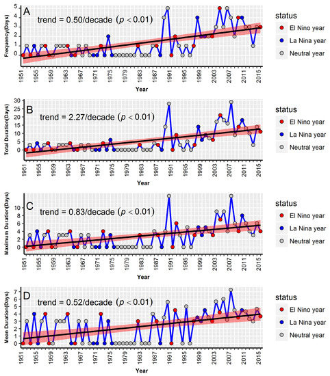 Annual time series of frequency and duration of heat waves in Guangzhou during 1951–2015. (A) Frequency; (B) total duration; (C) maximum duration and (D) mean duration. The linear trend line (black line) and the corresponding 95% confidence intervals (the shaded areas) are also shown. The solid dots in different colors show the occurrence of El Niño years, La Niña years and Neutral years.