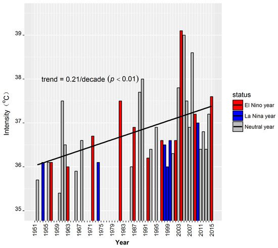 The intensity of heat waves in Guangzhou during 1951–2015. Annual intensity indicates the maximum value of daily maximum temperature during all heat waves in the year. The color of each bar shows the occurrence of El Niño years, La Niña years or Neutral years.