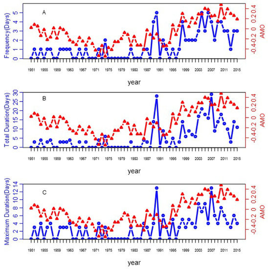 Similar to Boschat’s study in India, there was no apparent association between the characteristics of heat waves and ENSO events in our study [40]. Some studies have suggested the delayed effects of ENSO events on climate anomalies in China [20,33,34]. Heat waves may be not related to concurrent ENSO events, because of the lag between the responses in atmospheric circulation to the change in the sea surface temperature. Many studies have indicated the connection between heat waves and the sea surface temperature. In addition, a correlation between the sea surface temperature and the diurnal temperature range (DTR) and precipitation has been reported previously [41,42,43,44]. Consistent with the findings over the Northern Hemisphere and Arabic regions [41,45], significant correlations between the characteristics of heat waves and AMO/IOBW were found in our study, probably because all the variables showed an increasing trend. This explanation was proved by the fact that the linearly detrended data did not exhibit such correlation.