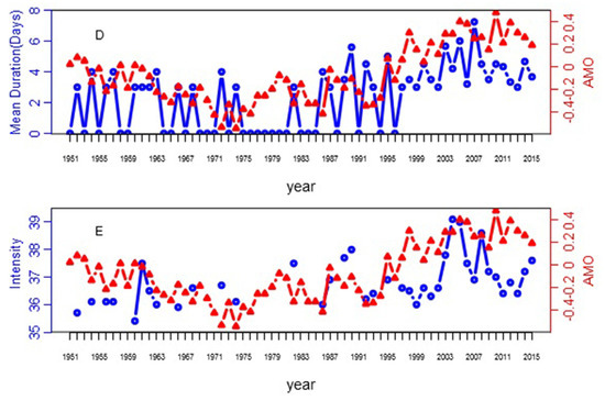 The time series of annual Atlantic Multi-decadal Oscillation (AMO) and annual frequency (A), total duration (B), maximum duration (C), mean duration (D) and intensity (E) of heat waves.
