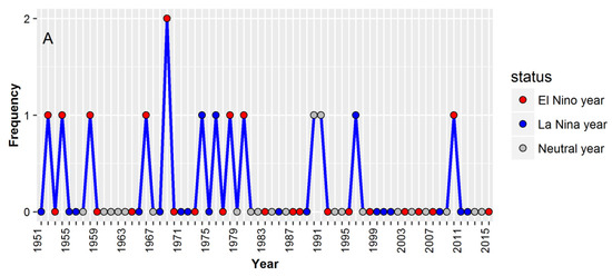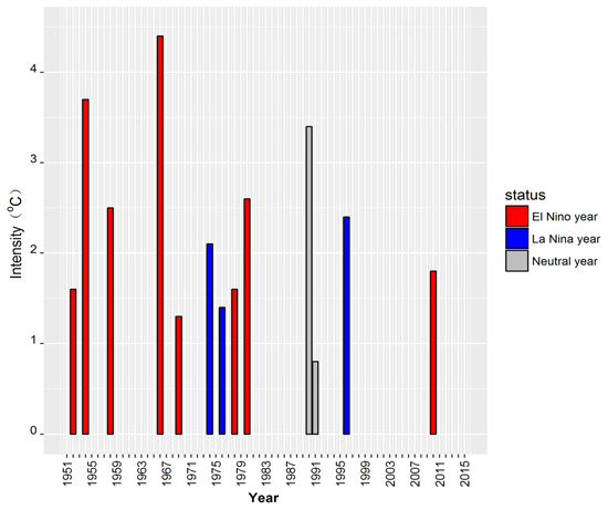 - Climate Prediction Center of National Oceanic and Atmospheric Administration. Available online: http://www.cpc.noaa.gov/products/analysis_monitoring/ensostuff/ensoyears.shtml (accessed on 20 December 2016).