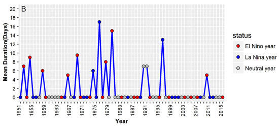 Time series of (A) frequency (B) mean duration (days) of Cold Spells in Guangzhou during 1951–2015. The solid dots in different colors show the occurrence of El Niño years, La Niña years and Neutral years. The index of total duration and maximum duration of cold spells was ignored due to only one or two cold spells per year.