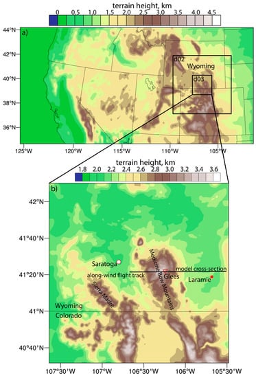 The present study documents a downslope wind storm, a deep updraft and rotors in the lee of the Medicine Bow Mountains (MBM) in southeast Wyoming, USA (Figure 1). This range is lower and narrower (in the cross-wind direction) than the Sierra Nevada or the Rocky Mountain Front Range, but like those ranges it is asymmetric, with a steeper lee side than the windward side. Recent observational [] and modeling [] studies focused on boundary layer separation, rotor formation and wave breaking in the lee of the MBM. French et al. [] used the same aircraft and airborne radar as used herein (i.e., the Wyoming Cloud Radar or WCR), but their observations are relatively limited since they lacked radiosonde data on the windward side and were collected in a brief period. This brief period of data collection was sufficient to capture rapid dynamic evolution of the downslope windstorm []. A follow-up study by Strauss et al. [] analyzed WCR and flight-level vertical velocity data to quantify turbulence intensity (more specifically, the cubed root of the energy dissipation rate) in breaking mountain waves.