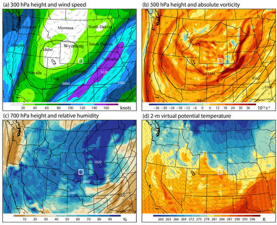 Synoptic condition from the 12 km NAM data at 0000 UTC on 12 January 2013. Wind barbs (full barb = 10 knots) are shown at each level, including at the surface (10 m) in (d). The white box in each panel shows the location of the Medicine Bow Mountains.